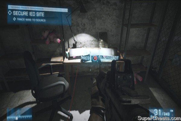Next follow your team mates as you cross the other building and descend to ground level. Continue to the next building where you'll find another ammo cache. Resupply and continue clearing the building. Head outside to find a destroyed HUMVEE and stay put until your orders are given. Trace the wire as instructed and it will lead you to a set of devices in a basement. Interact with it and beat up the terrorist who will attack you.