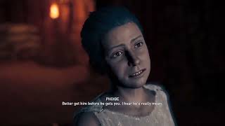 Either way, after talking to the merchant, you’ll have to talk to Markos next. You’ll find him outside the temple right outside the town, talking to one of Cyclops’ brutes. After the cutscene, Drucilla the bowyer will arrive and berate Markos about the delayed shipment of wood that’s been being intercepted by the bandits. To resolve this task, you’ll need your broken bow fixed first.
